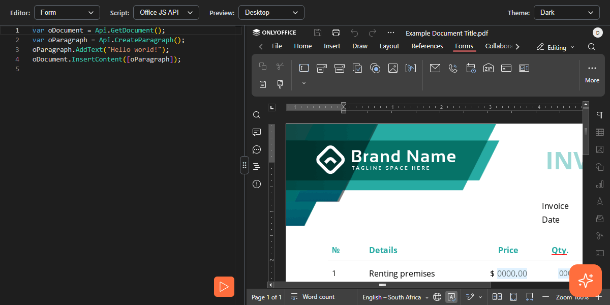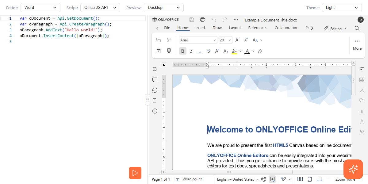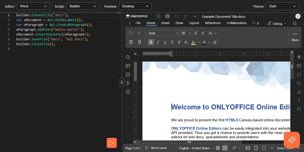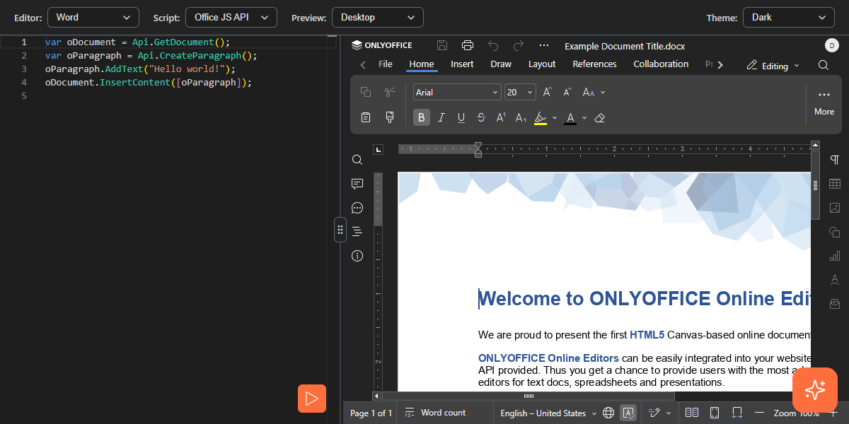 • Live preview. See the result of your script instantly in the embedded document editor.