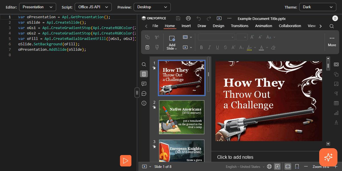 • Script testing. Write and run JavaScript code using one of the provided ONLYOFFICE APIs (Office JavaScript API, Automation API, or Plugins API).